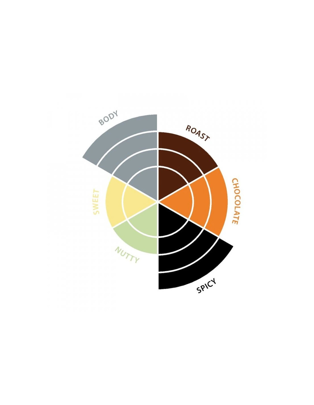 Geschmacksprofil: Fülle 4/5, Röstung 2/5, Aroma 3/5, Säure 2/5. Der Kaffee wird in der klassischen Farbe der Espressomischung geröstet - Kaffee, der nie enttäuscht